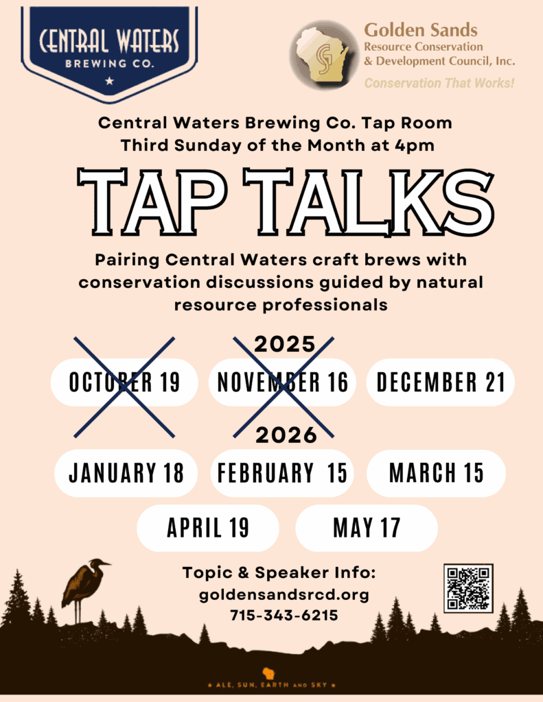All Tap Talks are informal presentations that encourage questions and lively discussion. Free and open to the public. No RSVP required, but we’d love to know if you plan to join us! Please contact info@goldensandsrcd.org or call us at 715-346-1264 if you have any questions. Grab a beverage and join us!